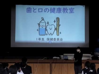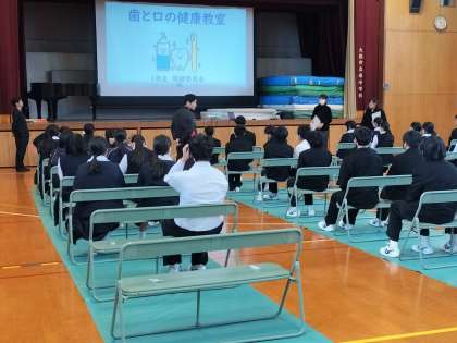 6時間目、1年生は体育館で「歯と口の健康教室」をしています。