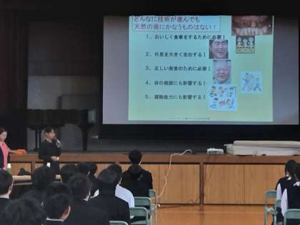 学校歯科医の藤原先生と歯科衛生士の川上先生にお越しいただき、「歯がなぜ大切なのか、歯を失わないために大切なこと、歯ブラシやデンタルフロスの使い方」について教えていただいています。