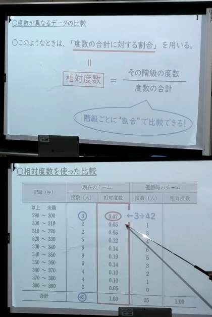 今日は度数分布表から相対度数を割り出す方法を学習しています。