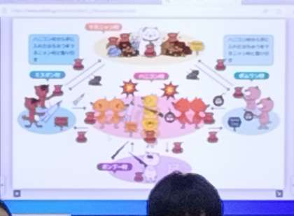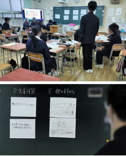今日は「アニマル国の紛争を解決する」ための方策を、A「和解のために」、B「家や財産を失った村民へ」、C「村民の格差」、D「失業対策」、E「ほかの村から」、という面から班ごとに考えて、発表してくれました。
