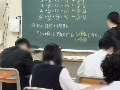 「数の性質がいつでも成り立つことを説明する方法を理解することができる」ことを目標に、今日は、「3つの続いた整数の和は3の倍数になる」ことを学習しています。