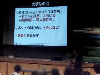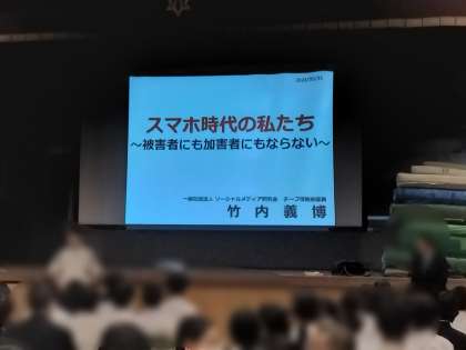 6時間目の参観で、外部から講師をお招きし、情報モラルについて講演をしていただきました。