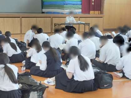 5時間目、3年生は、明日からの修学旅行に備えて、忘れ物がないか荷物をチェックしたり、修学旅行についていろいろ最後の確認をしています。