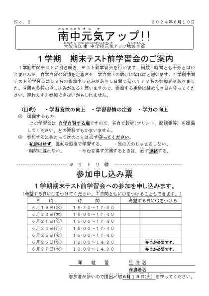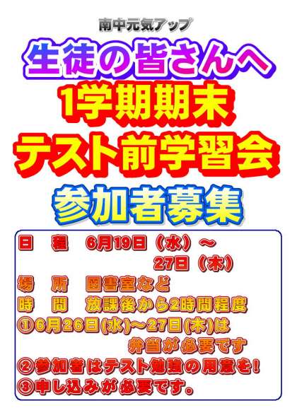 【南中元気アップ】1学期期末テスト前学習会のお知らせ