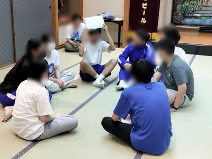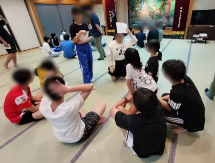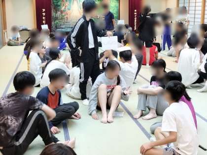鬼の頭の上のカードに書かれている単語を鬼に当てさせるゲームです。