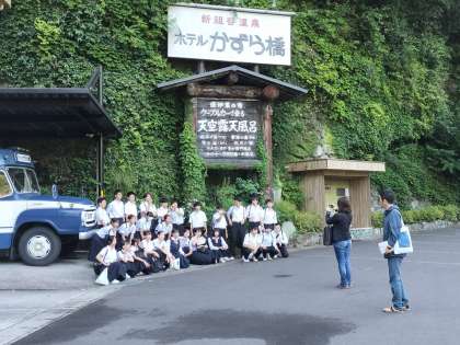 宿舎前で集合写真を撮り、バスに乗車しました。これから、香川県の金刀比羅宮に向かいます。