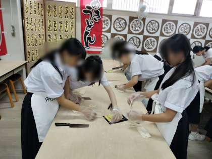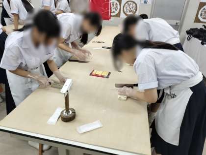 伸ばした生地をたたんで、約4ミリの太さに切っていきます。