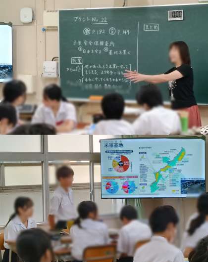 沖縄の米軍基地問題を解決する方法を班で話し合い発表しています。