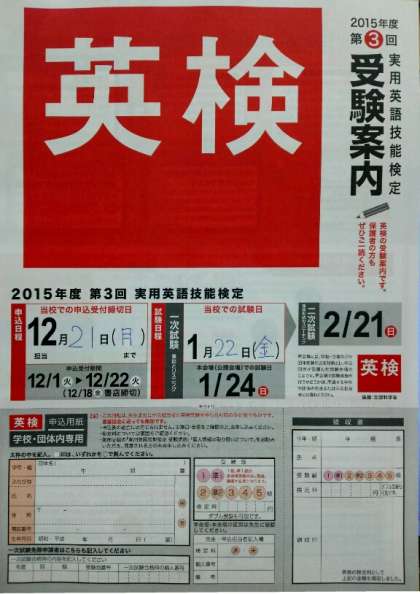 第2回英検は全校生徒の3分の1が受検し、最終合格率83%を超える素晴らしい結果でした。1月22日(金)にまた第3回の校内受検を行います。1年生で5級、2年生で4級、3年生で3級が目安です。校内申し込みは12月21日(月)とします。申し込み書は教頭まで取りに来てください。