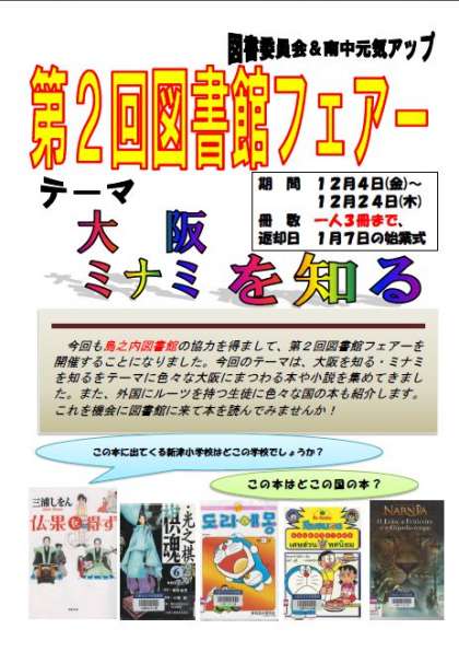 今回も島之内図書館の協力を得まして、第2回図書館フェアーを開催することになりました。今回のテーマは、大阪を知る・ミナミを知るをテーマに色々な大阪にまつわる本や小説を集めてきました。また、外国にルーツを持つ生徒に色々な国の本も紹介します。これを機会に図書館に来て本を読んでみませんか!