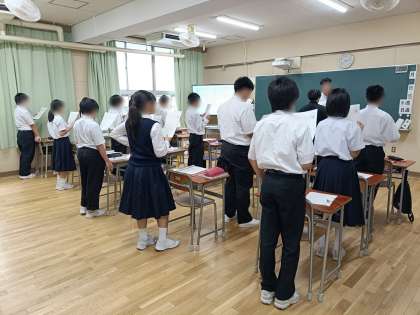 全員起立してプリントの英文を読んでいます。