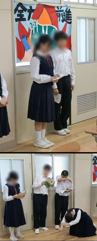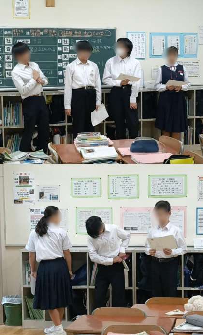 『平家物語』の熊谷直実と敦盛のシーンを6つの場面に分けて、班で1場面ごと分担して、劇にしています。