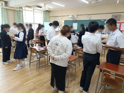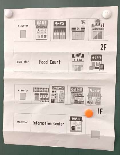 プリントのお店の図から、自分の好きなお店までの道案内を英語でしています。