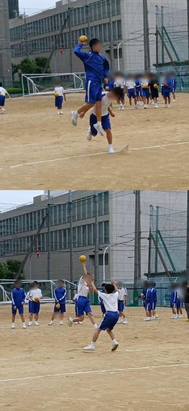 男子はハンドボールで、1対1でシュート練習をしています。