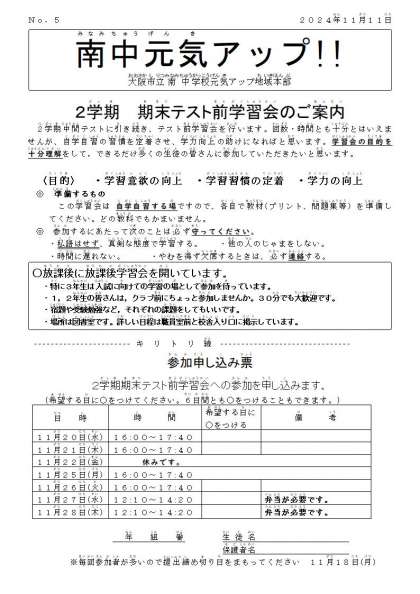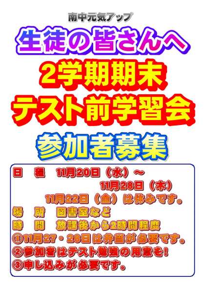 〈南中元気アップ〉2学期期末テスト前学習会のお誘い