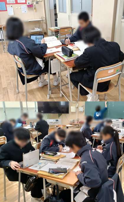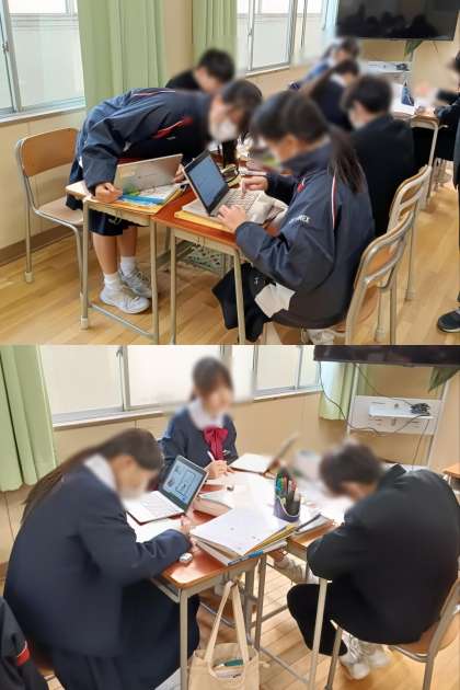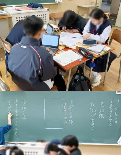 百人一首大会のリーフレットを、班で協力して作製しています。