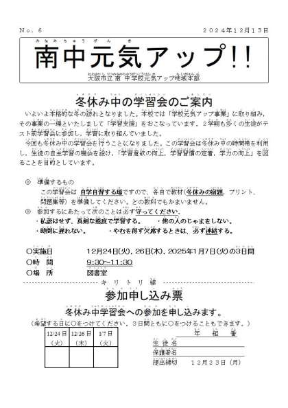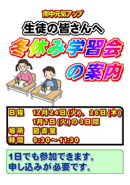 冬休み期間の3日間、図書室で学習会をおこないます。