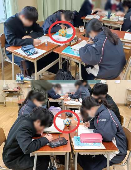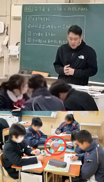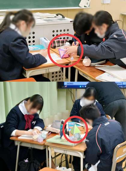 各班に配られた、正多面体の具体物の特徴を班でまとめています。