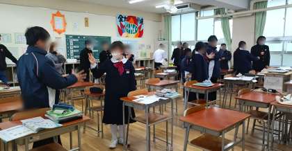 ジャンケンをして、モニターに出た疑問文を読む人と答える人に分かれて練習しています。