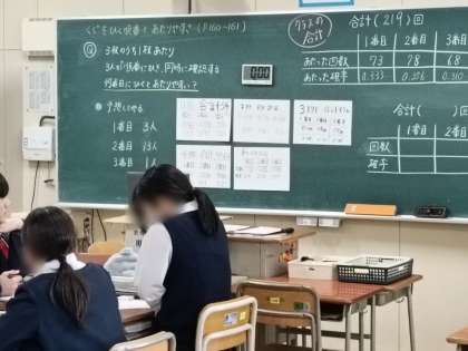 3枚のうち1枚あたりのカードを3人が順番にひき、同時に確認する場合、何番目にひくと当たりやすいかを予想したあと、実際に班ごとに合計219回実験しました。