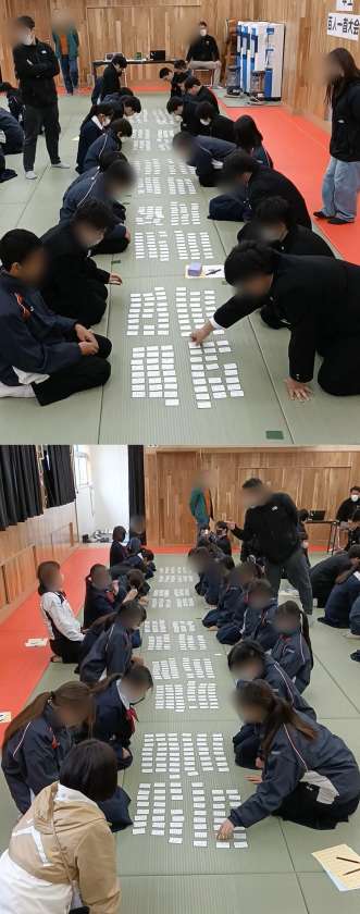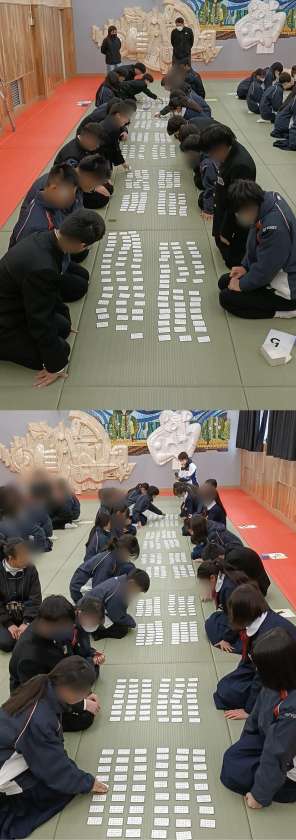 5時間目、1年生は格技室で、百人一首大会をしています。です。