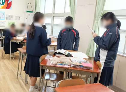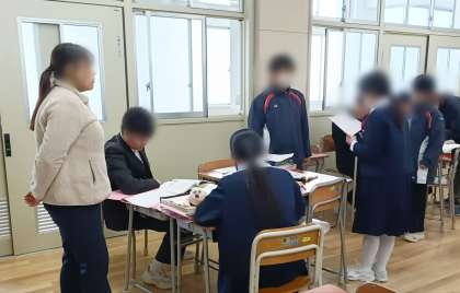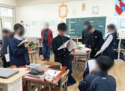 「走れメロス」を各場面で分けて、班ごとに違う場面の寸劇を行うため、班で練習をしています。