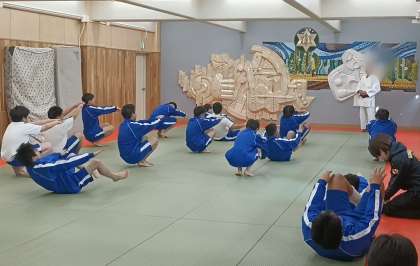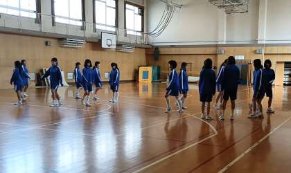男子は後ろ受け身、女子は、ダンスのステップの練習です。