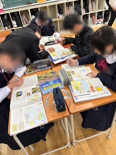 色々な国の特色について、班で調べたり、教えあったりしながら学習してます。