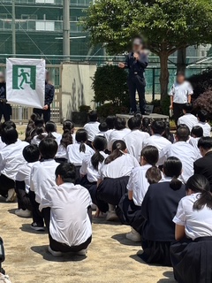 避難後には、消防署の方から、非常口マークの意味や避難経路の確認をしておくことなどお話しをしていただきました。