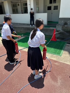 次に、学年ごとに、煙体験、水消化器訓練、搬送法学習を実際に体験しました。