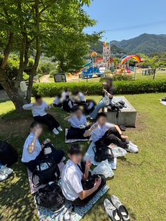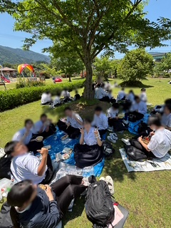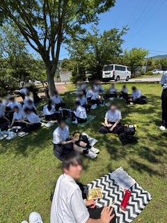 集合後、清々しい青空のもと、芝生の上で昼食です。