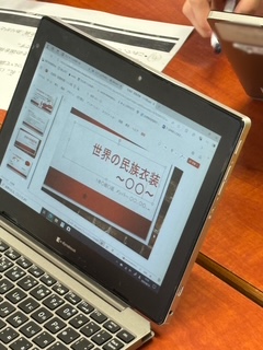 世界の民族衣装について、学習者用端末を活用しながら、班で調べています。
