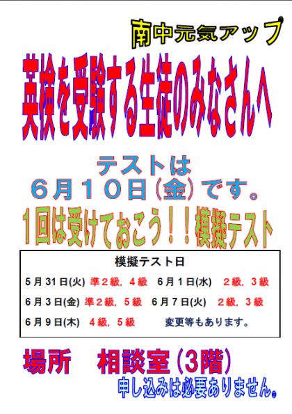 また来週月曜日から、午前7:30〜8:10の間、図書室を開放し、英検過去問の演習を行います。自由参加ですが、絶対に合格したい人は、是非参加してください。