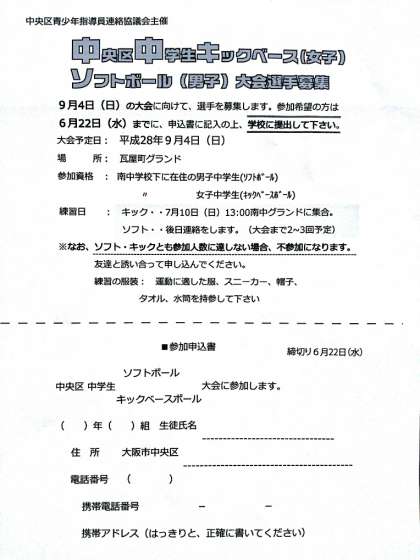 中央区青少年指導員連絡協議会主催『中央区中学生キックベース【女子】ソフトボール【男子】』大会が行われます。