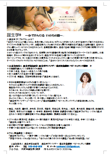 テーマは「誕生学」です。誕生学とは「生まれてきたことが嬉しくなると、未来が楽しくなる」をコンセプトにした子供から大人までの全世代に「命の力を伝える」ライフスキル教育プログラムです。出産妊娠のしくみと命の大切さに関する知識を伝え「誕生」に主眼を置き、生まれながらに備わっているスゴイ力を伝えることで、自尊感情を育み、自他の生命の尊重やセルフケア行動の同期づけができる教育プログラムです。