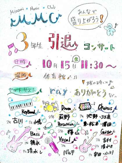 明日15日(土)は土曜授業の日で芸術鑑賞(古典落語)を行います。その後、11:30(予定)から音楽部3年生の引退コンサートを体育館で行います(約30分)。お時間が許せば、保護者の皆様も見に来てあげてください。音楽部卒業生も歓迎です。