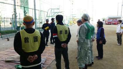 午後から道仁連合町会の防災訓練がありました。連合町会長を本部長として、区長・副区長をはじめ、消防の方々や地域のたくさんの方が参加されました。