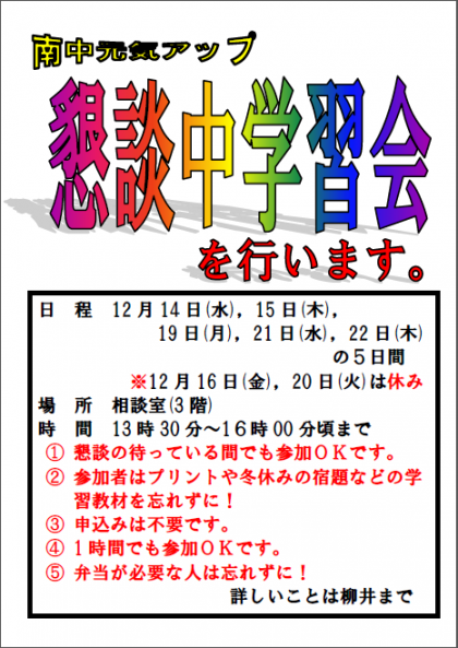 12月14日(水)15日(木)19日(月)21日(水)22日(木)の5日間、図書室で学習会を行います。時間は13:30〜16:00頃。