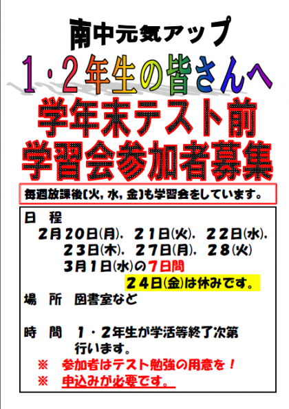 2/13(月) 1・2年学年末テスト前学習会の案内