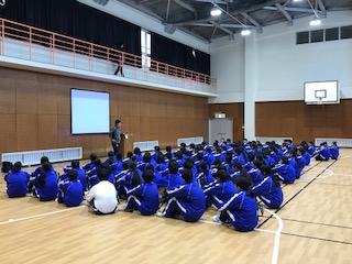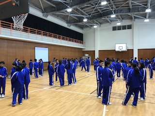 2日目の活動のオリエンテーリングの前に 集団行動についてお話を聞きました。それぞれが考えて動く事やあいさつについて考え、班で あいさつの練習をしています。
