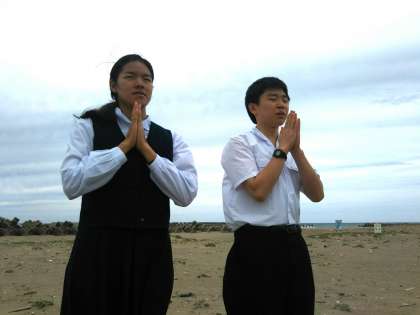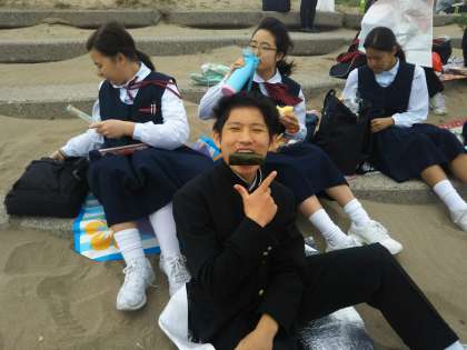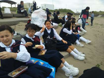 海辺で日本海を眺めながら楽しい昼食を…の予定が、強風のためかなり慌ただしいものになってしまいました。中にはお弁当を砂浜に落としてしまう人も。でも大丈夫。クラスメイトから「おかずあげる!」と次々声がかかり、友情弁当は山盛りになりました。