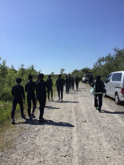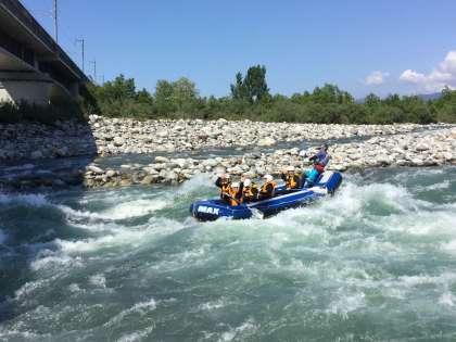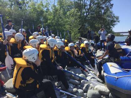民泊体験の次は黒部川でラフティング体験を行いました。ウェットスーツに着替えて川辺に移動し、インストラクターの説明を聞いてから、班ごとに分かれてボートに乗り込み、みんなで協力しながら楽しく活動できました。