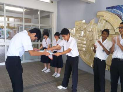 本日の学年集会で、修学旅行で行ったレク大会の表彰式が行われました。賞状もレク係の手作りのものです。