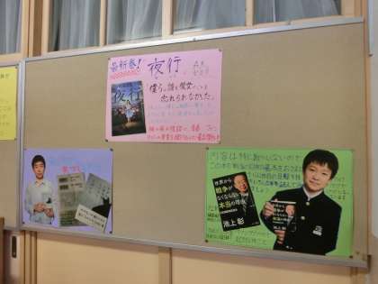 図書委員会は他の委員に比べて人数は少ないのですが、図書室と本を愛するメンバーががんばっています。図書委員会では、どうしたらたくさんの人に本に親しんでもらえるか、本のポップを作ったり、ポスターを書いたり、知恵を絞ります。昨年度は読書駅伝にもチャレンジ しました。