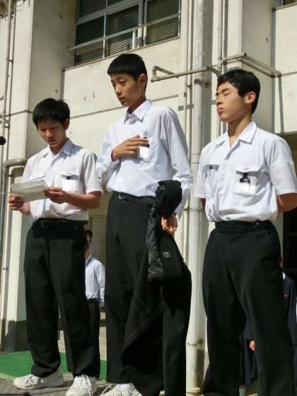 生活委員会は、南中学校全体の日々の生活環境をよくするために頑張っています。全校集会で正しい標準服の着用についてわかりやすく説明しました。