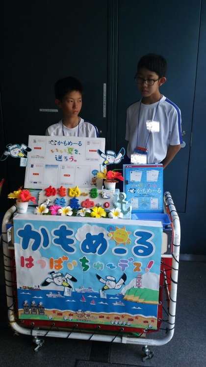 南郵便局では、自分たちで販売促進のためのポップを作成しました。窓口にてかもめ〜るを販売しているところです。