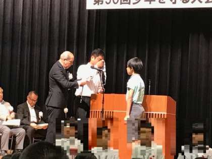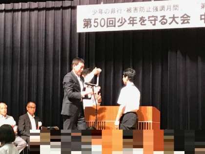 本校生徒が表彰を受けている様子です。現在、入賞した作品は中央区役所の1階に展示されています。