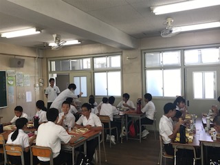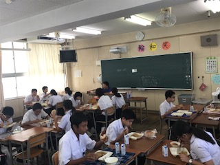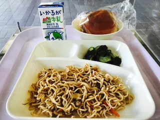 焼きそば、きゅうりとわかめの中華あえ、パン です。