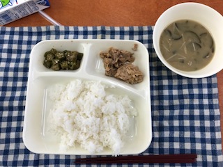 豚の甘辛焼き、みそ汁、オクラのおかかいため.