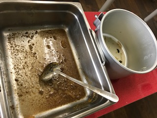 からになったプルコギと甘酢あえのお鍋。プルコギの肉汁を、おかわりのご飯にかけて食べる人もいました。